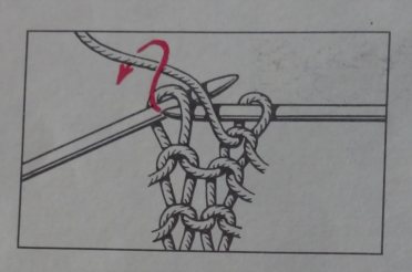 3-й ряд: 2 изн., 1 лиц. скрещ.п., 1 накид, 1 петлю переснять не провязывая, 1 лиц.скрещ.п… повторять до конца ряда, закончив 2 изн.