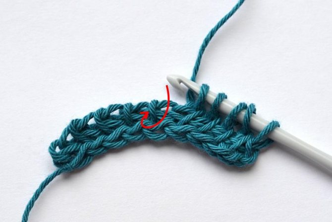 - Не меняя положения вязания, следует произвести набор петелек на крючок. Первая петля набора должна пройти через предпоследнюю ВП. Образующиеся петли не требуется вывязывать. Они должны оставаться на крючке.
