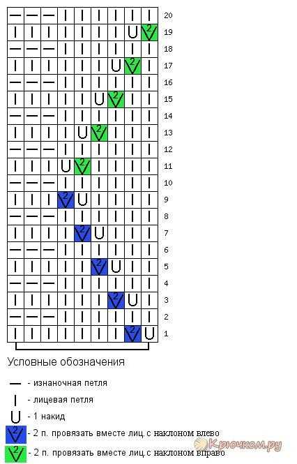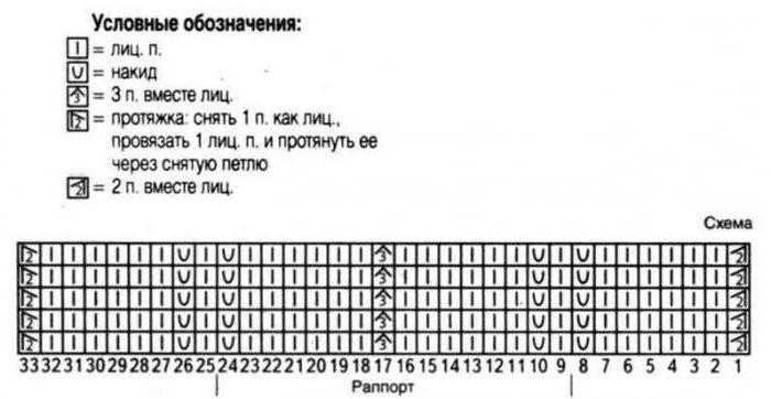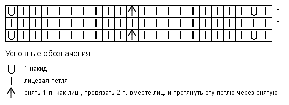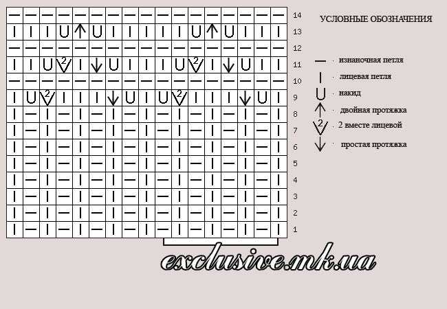 - 11Р.: 2 лицевые, 1 накид, 1 протяжка, 3 лицевые, сдвоенные лицевые, 1 накид. Этот раппорт повторяется необходимое количество раз.