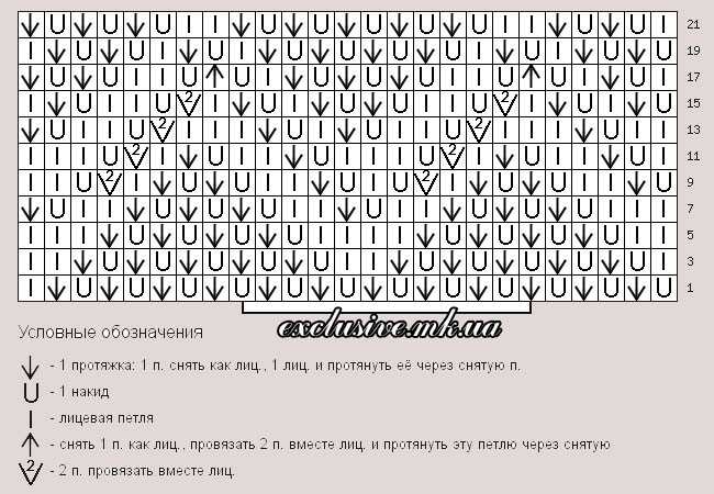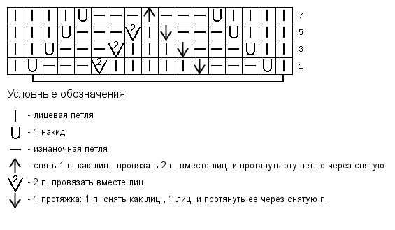 Раппорт состоит из 7 петелек. Вязание начинаем с нечетного ряда по схеме. Четные ряды провязываем по рисунку. Постарайтесь сделать еще более выразительный узор. Это очень просто – всегда при протяжке делайте среднюю петельку сверху. Для этого снимайте 2п. как лицевые (можно скрестить), затем 1п. провязываем и протягиваем в снятые.