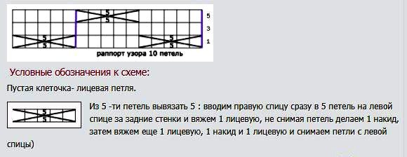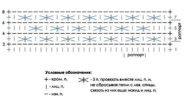 - 2р. (лицевой): 1л., *5 лиц., каждая с 3-мя накидами (см. предыдущее описание), 1 лиц.* – от * и до * повторить на всех п.;