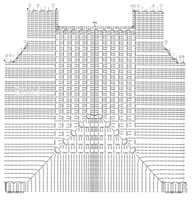 - Далее проводится общая обвязка. Воротник, верх и низ на кокетке обвязываются таким образом: 1-й ряд СС2Н через 7 ВП, повторяется необходимое количество раз. Далее вязание проводится по схеме 4.
