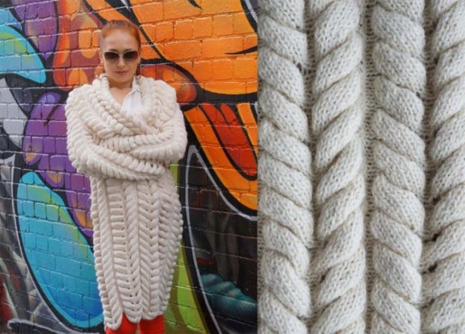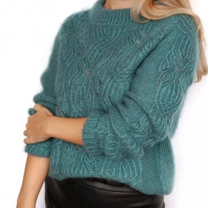 Расчет и схема особой верхней детали одежды с узором аналогична с приведенным выше вариантом. Рукоделие выполняется по лицевой стороне. Использование узорчатого плетения прекрасно украсит пуловер, кофточку или платье: