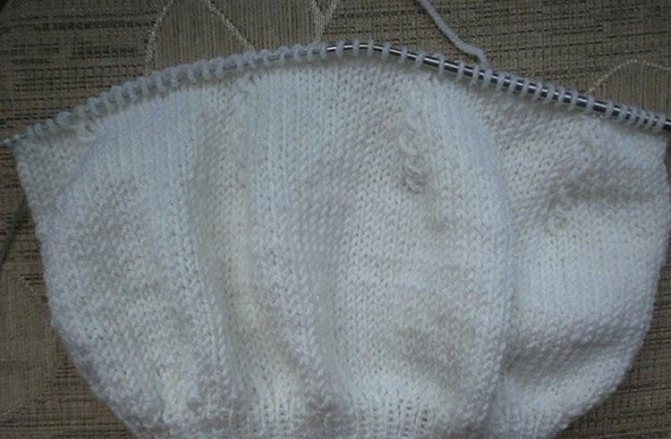 Возьмите спицы №3 и ставим маркеры через каждый 24-26 петелек. Вяжите дальше платочной вязкой. Там, где стоят маркеры делаем прибавки, пока не увеличим первоначальное число петель на треть примерно.